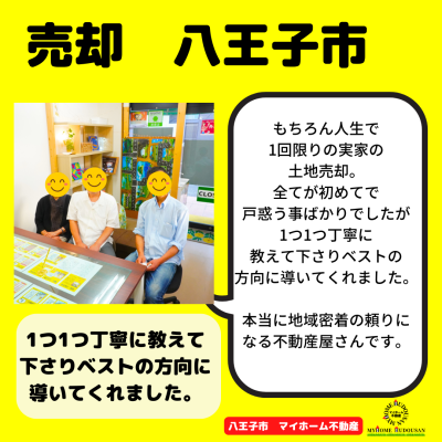 当初は色々な売却方法で迷われていらっしゃいましたので、どんな風に売却を進めたら良いのか、 しっかりとヒアリングを行い、ご質問にお答えしながら一番良い売却方法を探って参りました。 が、ご家族で何度も相談を重ね、 「価格が安くなっても何もしなくて良い様な、一番楽な売却が良い」 との結論に至ったとご連絡がありました。 そこで様々な業者様に相談をいたしましたが、荷物の撤去や測量、解体工事などは、やっていただきたいとの不動産会社が多く、マイホーム不動産で買取りを行う事になりました。 大きなお家でしたのでその分お荷物も多かったのですが、ご家族で必要なものだけを選別して、まずはお家からお持ち頂きました。 その後に荷物の片付け業者さんや測量、解体工事の手配をかけ、綺麗な更地になりました。 売主様ご家族に大変喜んで感謝頂けた事、本当に嬉しく思いました。
