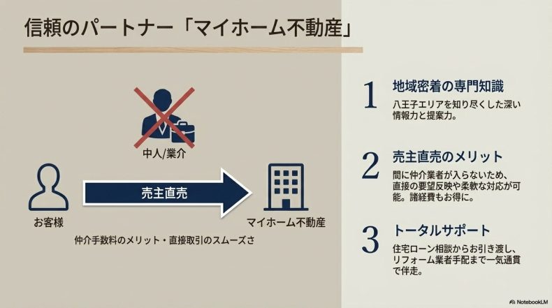 売主のマイホーム不動産(TEL:042-634-9527)なら、しつこいセールスもなく安心して直接ご相談いただけます。ぜひお気軽にお問い合わせください!