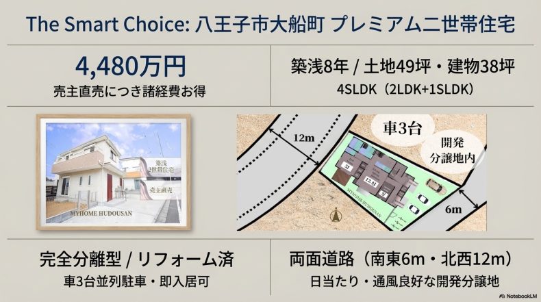 1. 仲介手数料無料!初期費用を大幅カット 通常、不動産を購入する際には物件価格に対して約3%の仲介手数料がかかります。しかし、この物件は「マイホーム不動産」が直接の売主となっているため、仲介手数料が一切かかりません。直接取引によって、購入時の諸経費を大幅にお得に抑えることができます。