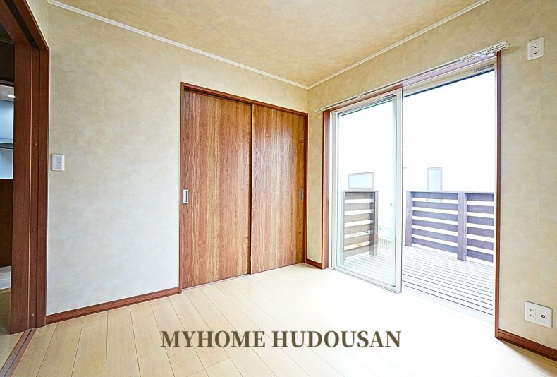 1階にある5帖の洋室からは、フラットに繋がる約3帖のウッドデッキに出ることができます。